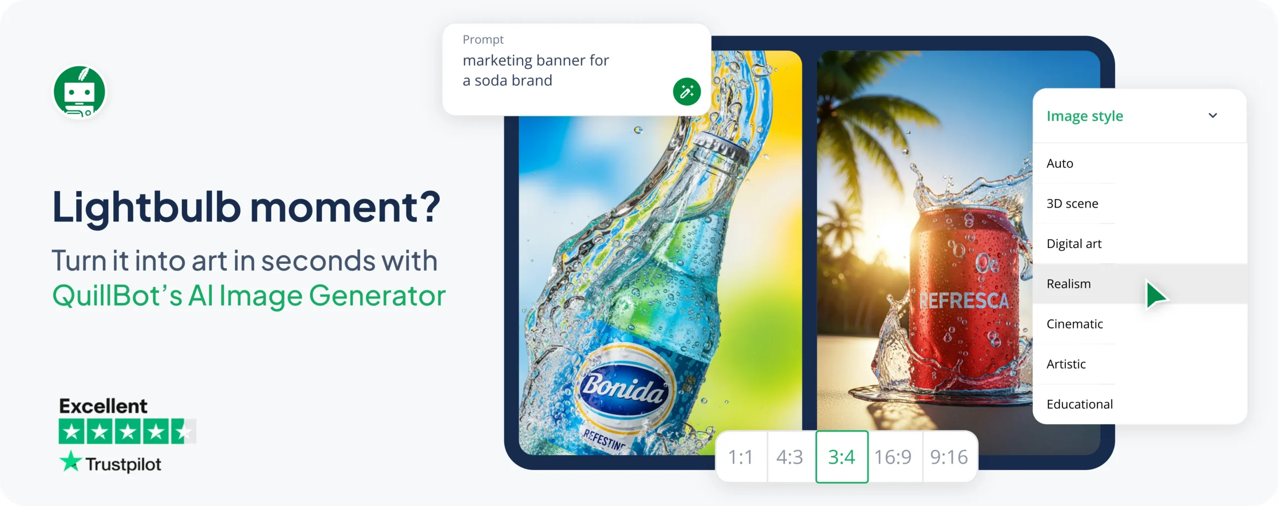 QuillBot’s AI image generator turns text into stunning photos, pictures, and artwork in seconds. Just describe the image you want to create, choose the style (e.g., anime, artistic, or realism), set the aspect ratio, and the AI image generator takes care of the rest!