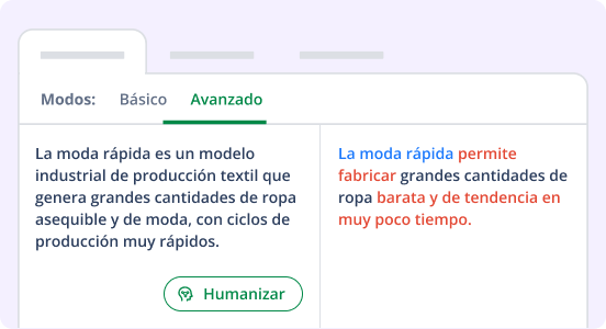 Humanizar también mantiene el significado original, pero solo ajusta la estructura, la longitud de las frases y algunas palabras para que el texto resulte menos artificial.