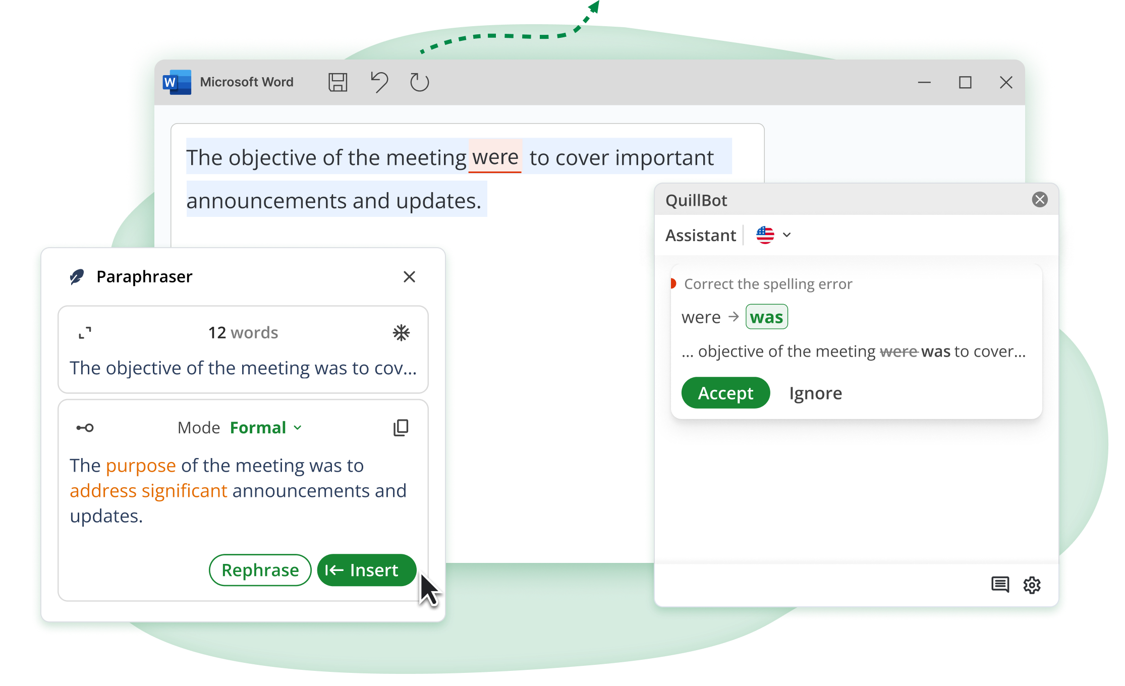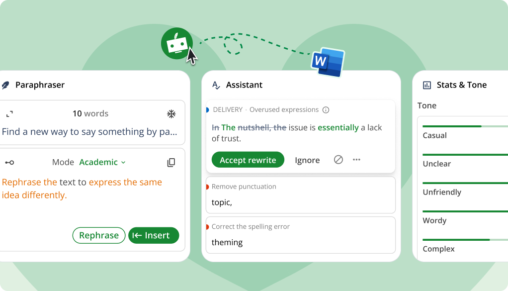 Our free MS Word add-in combines QuillBot with the classic word processor, giving you a seamless editing experience. Install our add-in for Microsoft Word online or for the Microsoft Word app on your Windows or Mac computer.